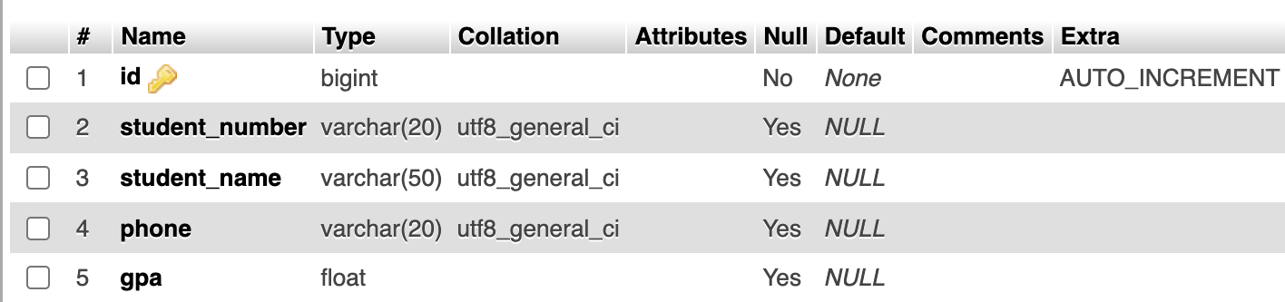'INSERT INTO student(student_number, student_name, phone, gpa) VALUE(%s,%s,%s,%s)',
