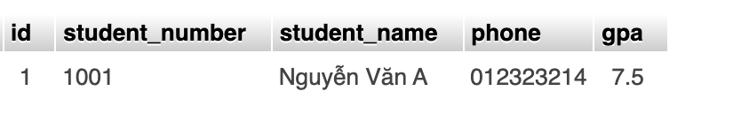 {'student_number': '1001', 'student_name': 'Nguyen Van A', 'phone': '012345678', 'gpa': 7.5},