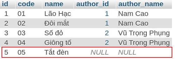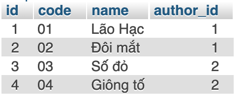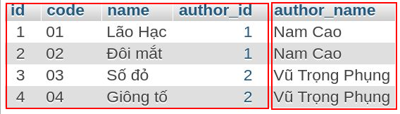 Ví dụ:Trong bảng Book không chứa thông tin tên tác giả mà chỉ chứa id của tác giả (author_id).