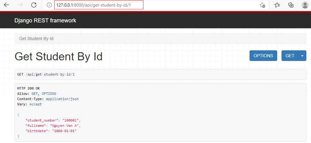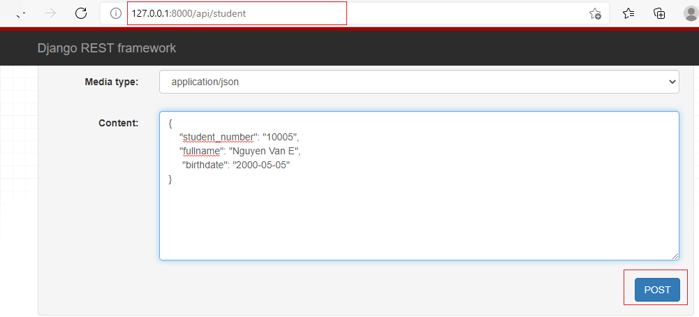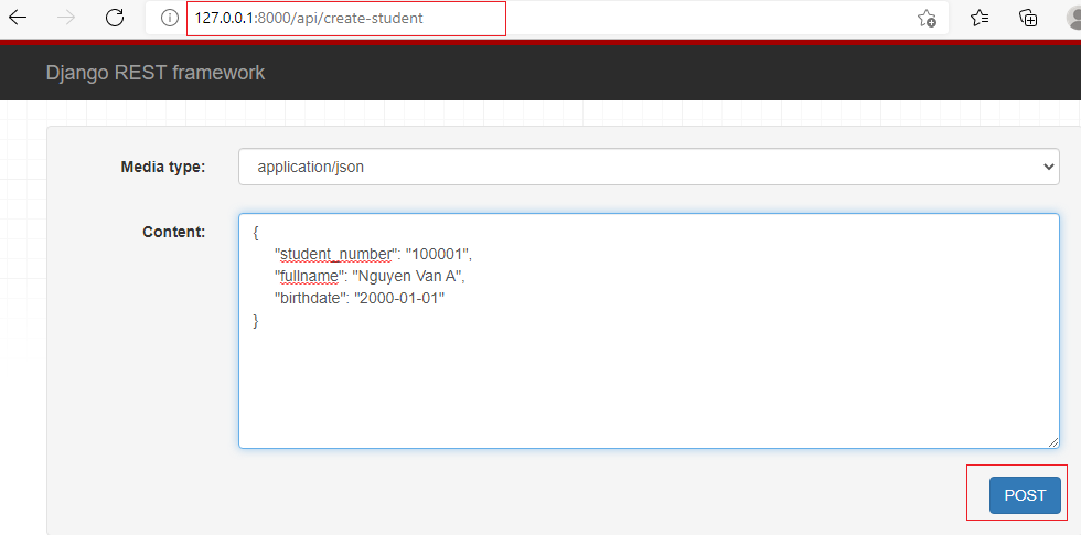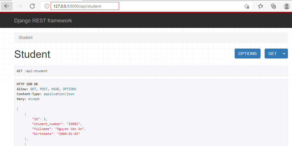 Do class StudentView hỗ trợ 2 phương thức get và post, có thể thực hiện gọi service đến http://127.0.0.1:8000/api/student thông qua cả 2 phương thức: