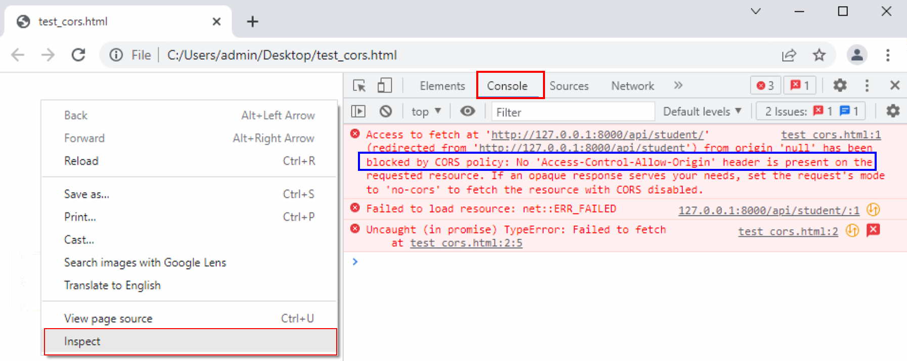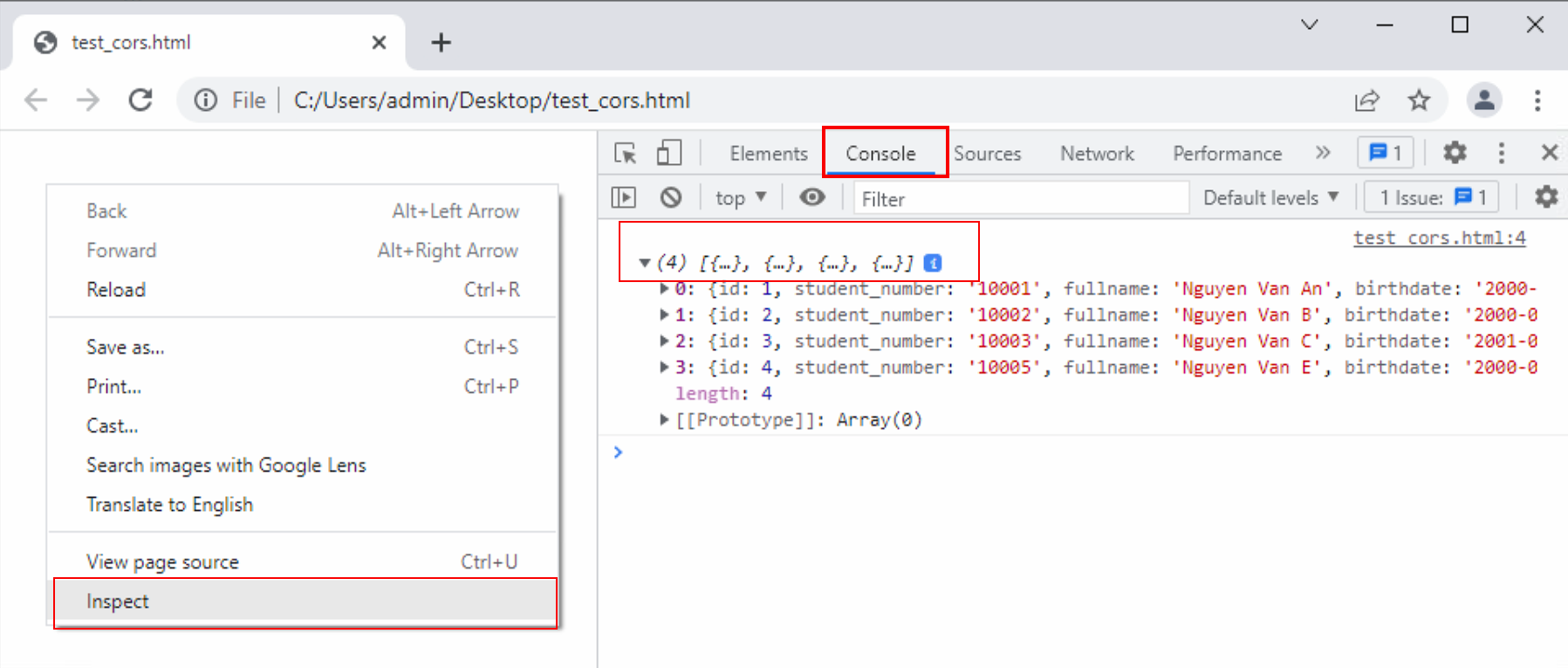 Để kiểm tra CORS đã được bật, tạo mới một file html với nội dung như sau: