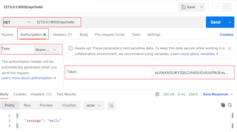 Sử dụng Postman để thực hiện gọi API có gắn token đi kèm. Sau khi nhập địa chỉ API vào thanh địa chỉ của Postman, sang tab Authorization, chọn Type là Bearer, phần Token nhập vào giá trị của trường access trả về ở bước trên.