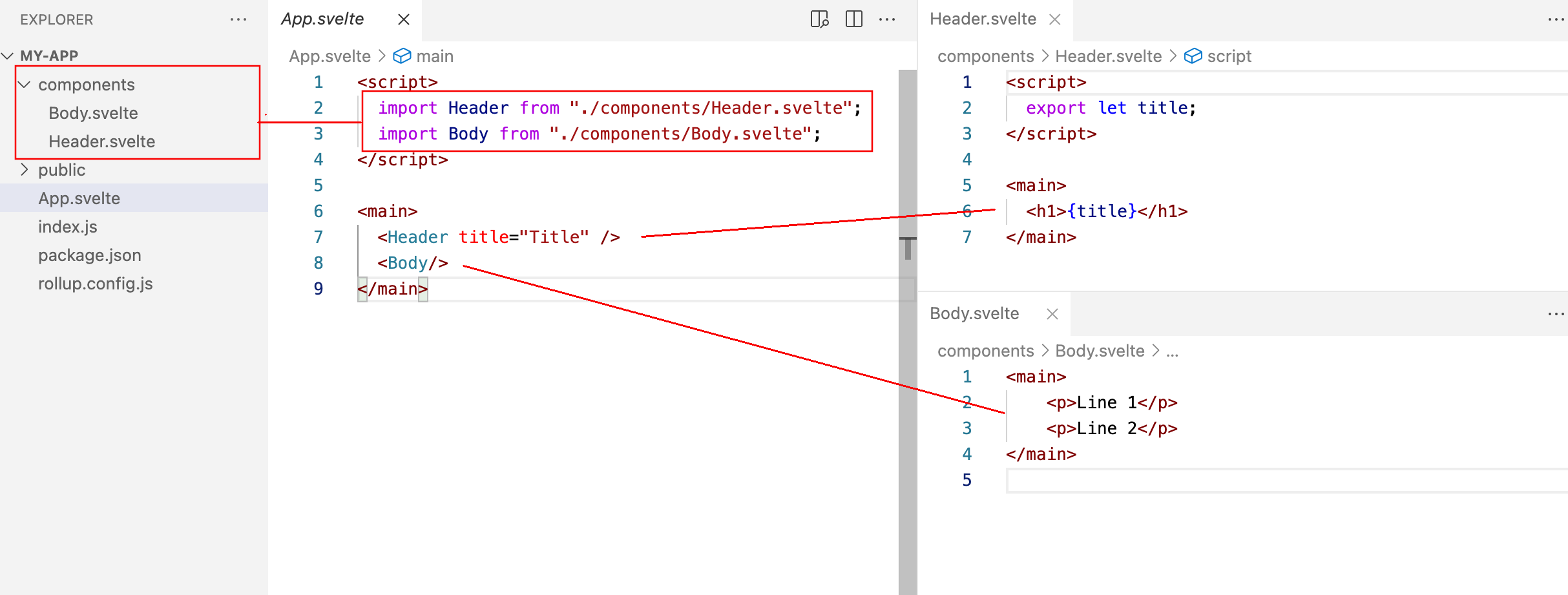 Mỗi component chứa một phần của ứng dụng: Header, Body, ..., file App.svelte import các component và ghép lại thành ứng dụng đầy đủ: