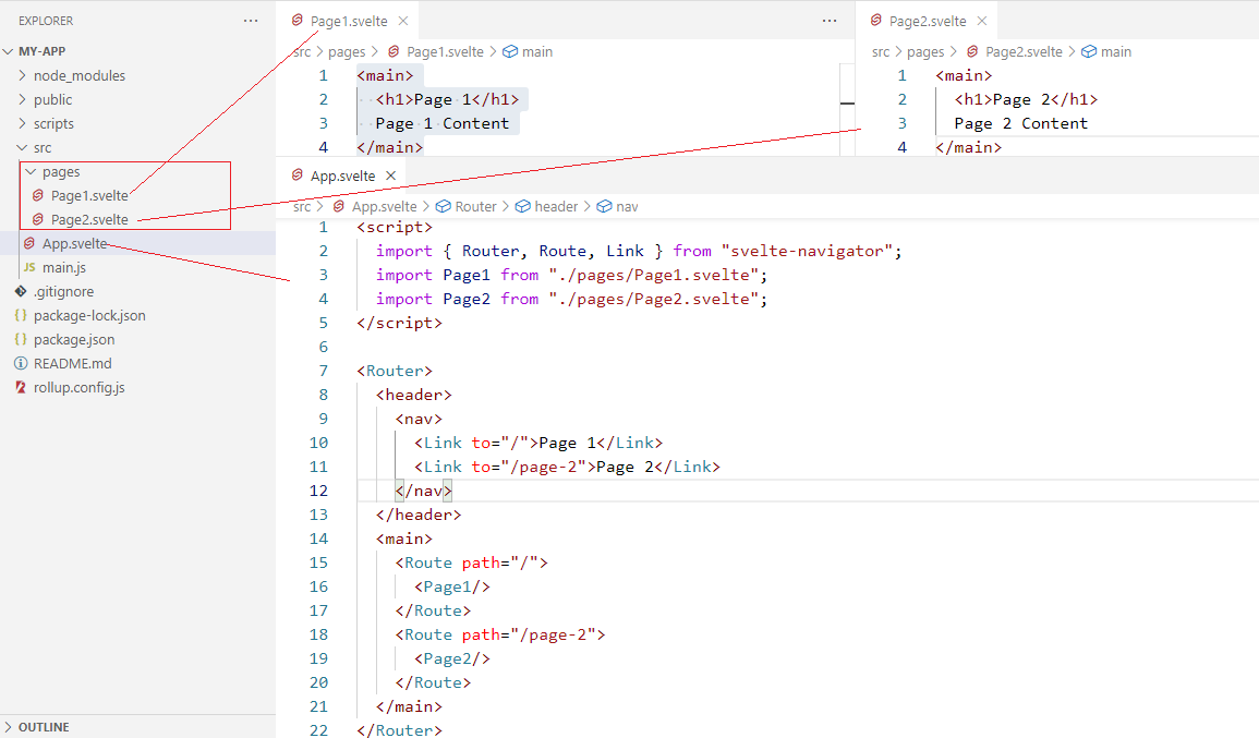 Tạo thư mục pages trong thư mục gốc ứng dụng, sau đó tạo 2 file Page1.svelte và Page2.svelte trong thư mục này